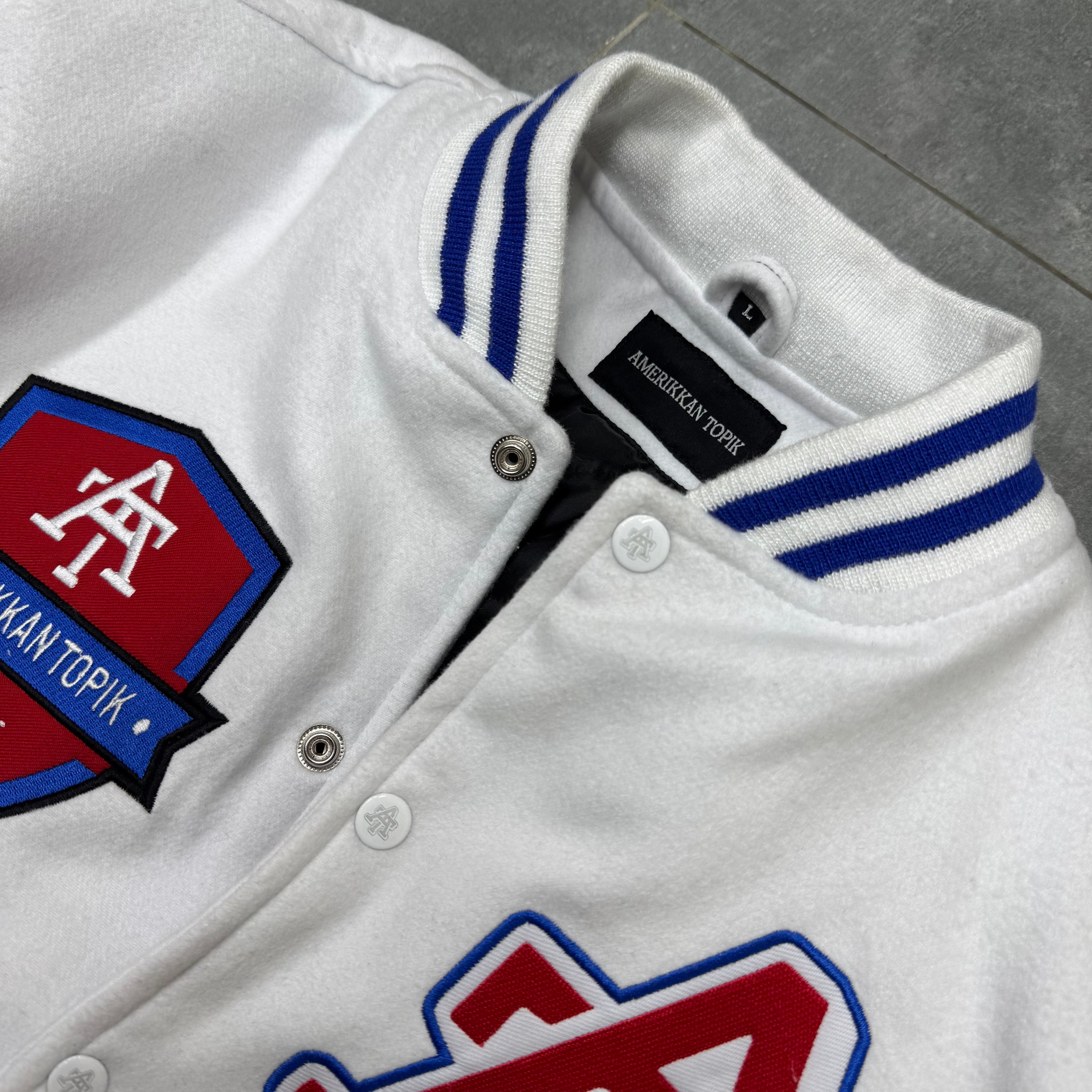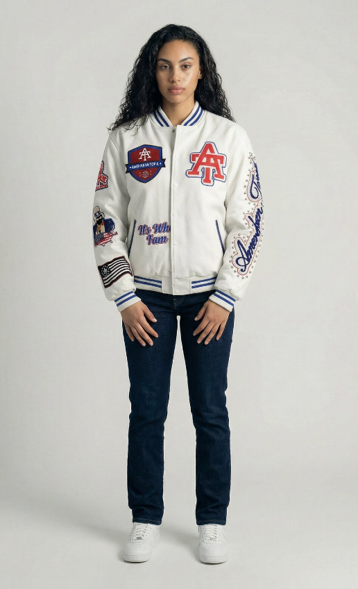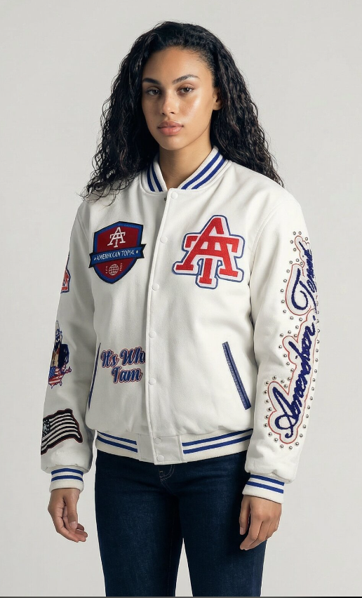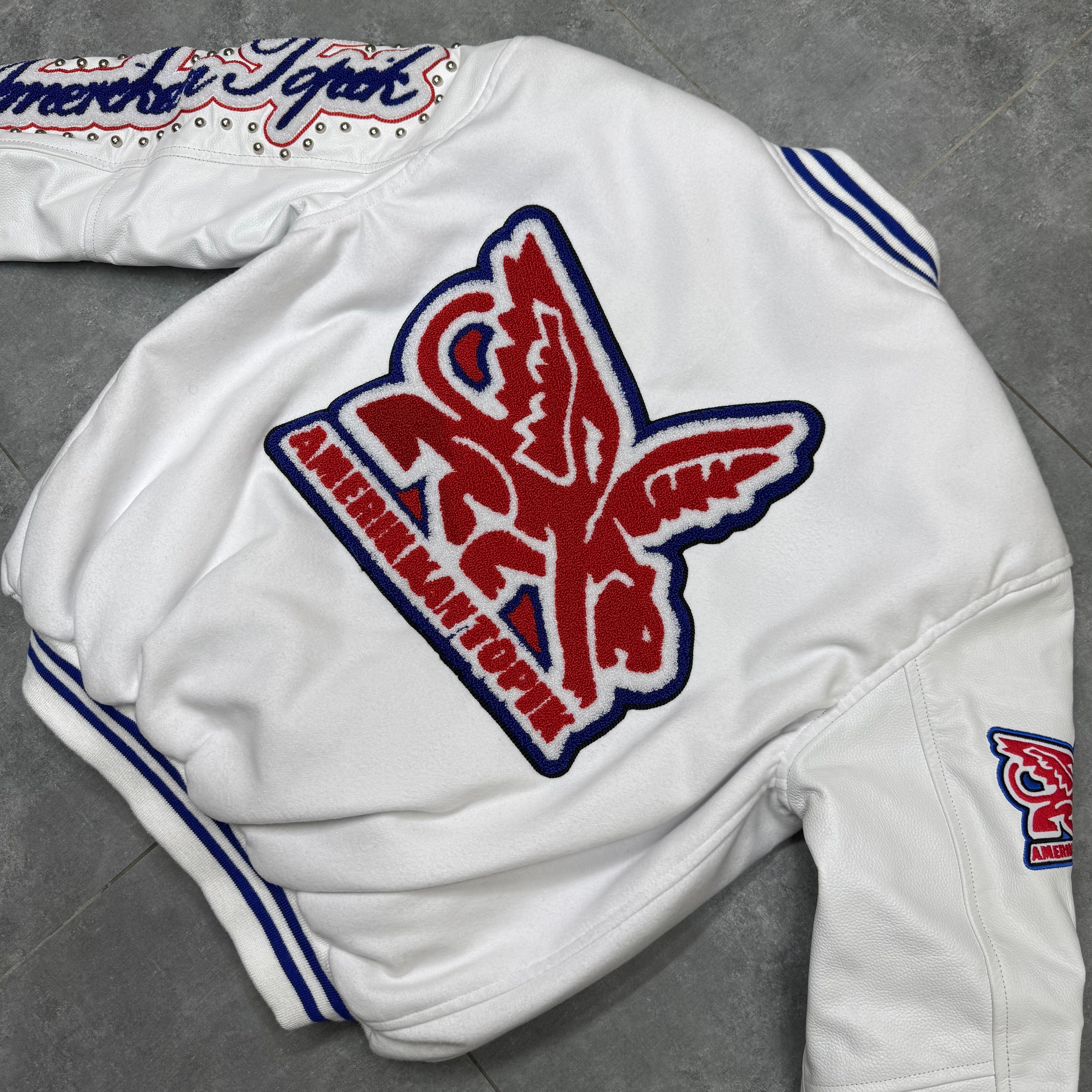 Our Varsity Jackets consist of a premium wool body and vintage leather sleeves with quality embroidery on the chest and sleeves along with superior chenille patch work engraved buttons and metal stud work around the sleeve
